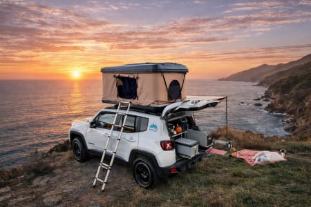 Fun camping vehicle perfect for tailgating, standard campgrounds and with the ability to reach many primitive camp sites not reachable with an RV. The roof top tent is 8ft x 5ft and equipped with a 2 inch memory foam mattress, (Optional sleeping bags for two), two USB charging ports for mobile devices and plenty of space to stretch out and get a good night sleep.