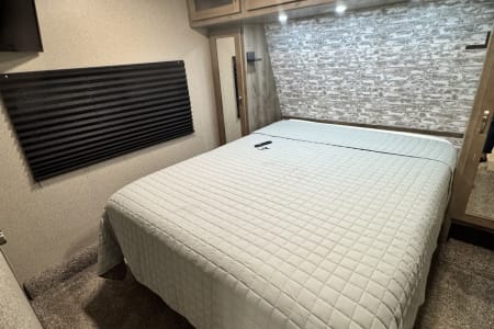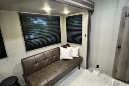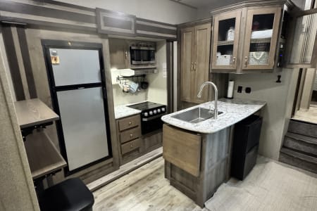 This 2020 Keystone Sprinter Fifth Wheel Bunkhouse has 1.5 baths! The bunkroom is perfect for teenagers that need their own space while camping. There are 4 TV’s, one in the master bedroom, one in the bunkroom, one in the living room and one in the outside kitchen. This camper has 3 AC units which is perfect for summer camping! It also has an instant water heater which means if you have a full hookup site with sewer you can take longer showers. There is a ton of storage in the camper and a huge pantry!