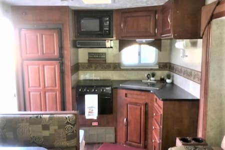 Cozy travel trailer large enough for a small family to fit comfortably but small enough to fit into some great campsites. Queen size master bed for a good nights rest. Also the dinette and couch fold into beds as well. Large slide out and an electric awning making for quick and easy shade. Tons of storage space. Included will be a couple rolls of TP, Pots, pans, paper plates, bowls and utensils, coffee pot or percolator, towels, camping chairs, life jackets, helmets. We also provide a sway control hitch. This trailer is fur baby friendly with a small fee. Other add-ons include, bedding, generator and pre-filled water.