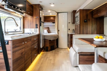 Piloting the Navion is super easy, thanks in part to the latest Mercedes-Benz convenience and safety features. DISTRONIC PLUS® takes cruise control to the next level, holding speed and maintaining a set distance from vehicles in front. Active Lane Keeping Assist warns you of unplanned lane departures, and can guide you back into your lane, and Active Brake Assist helps avoid collisions with pedestrians or vehicles in front of you. Motorhome also comes with powered and heated cab seats, a multi-function steering wheel with infotainment center controls, dash charging station with wireless charging, and a 10.25" MBUX® infotainment center , navigation, Wi-Fi hotspot, and rear color camera.