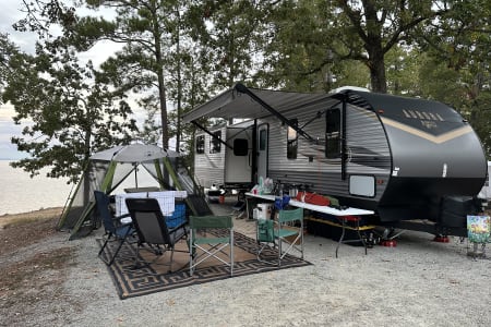 One of the great features is to be able to set outside and watch a movie while cuddling. You can also take a shower outside of the camper before coming in the camper which is a nice feature if you did not want to take one inside. There is a memory foam mattress on the queen that sleeps like a dream that was bought by us and is not the factory mattress so prepare for a good nights sleep.