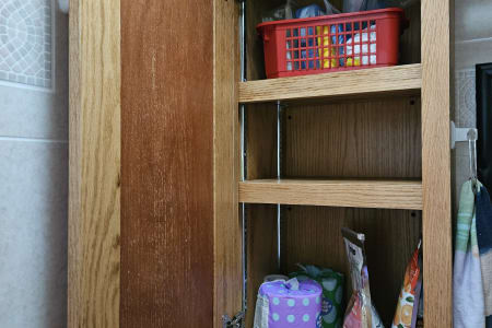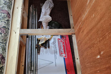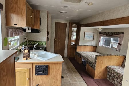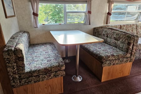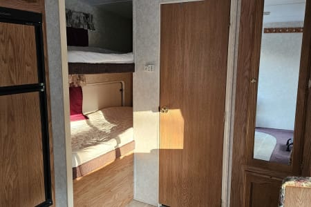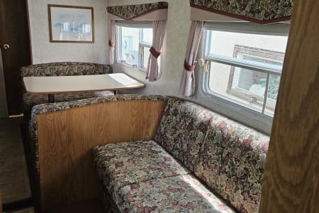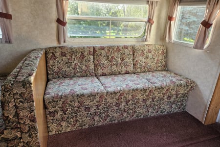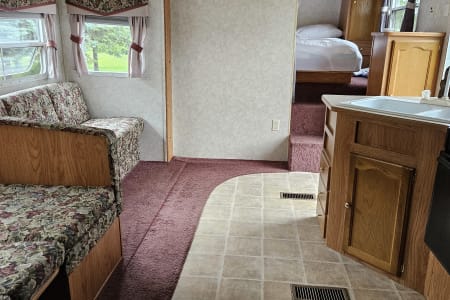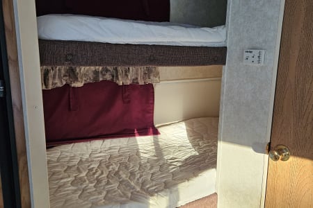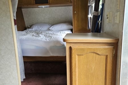 A comfy queen size bed above the hitch has small bedside cupboards on both sides. In the back, twin bunkbeds are right next to the bathroom. The slide out makes a spacious living area, and the table and couch both can be converted to beds (couch: 39" x 67"; table 45" x 72"). Sheets, blankets, and extra camping pads are included.