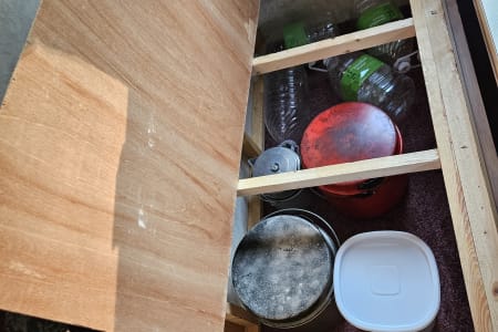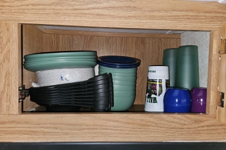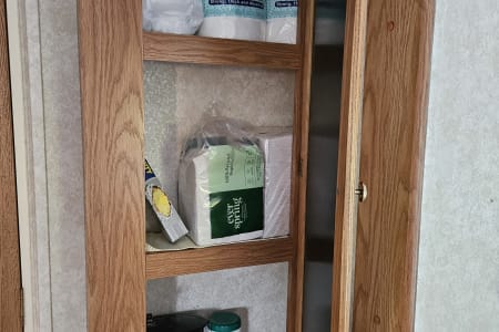Cooking supplies, dishware, and silverware are already stocked, and there is still plenty of storage for your food and other supplies. The sink is great for doing dishes and if you have full hookups you don’t even need to worry about having to skimp on water for rinsing! (Although we do encourage conservation.) There’s a fridge/freezer that runs on either electric or propane. The stove runs on propane and the microwave runs on electric, or there is a tripod grill and the pots have seen a few open fires so you can go rustic if you like as well! We even stocked the pie-makers and hot dog-or-marshmallow sticks.