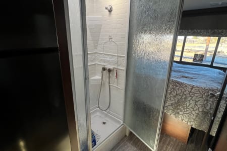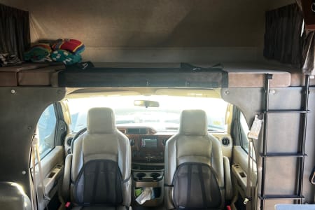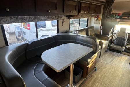 This easy to drive 32' RV features a bedroom slide with a walk around queen bed. Another slide at the living area provides for a spacious dining area for six with a full kitchen and two recliners. In addition to the Queen bed, the dinette and over cab loft provide beds for 4 more. The exterior features a large awning and an outdoor TV.