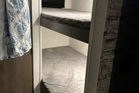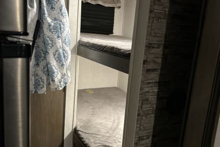 Full kitchen with Queen bed in front and bunkbeds in rear, suprisingly roomy with the slide out extended. Mom put all the things she would want in here so you just need family and food. Well stocked with all the basics and then some. We want people to enjoy themselves and not worry about having to pack everything.