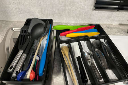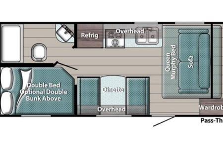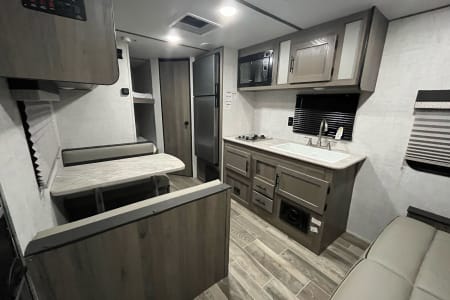 We love that she has bunk beds, each a full size. Two kids could fit on each bed with room to spare. She also has a murphy bed couch that turns into a comfortable queen bed. The dinette table and benches turn into another full size bed if needed.