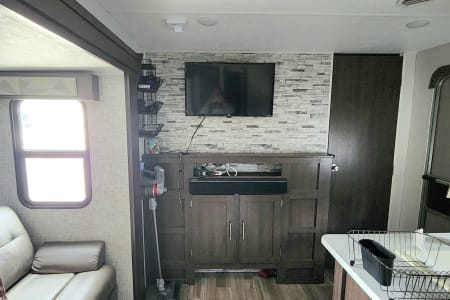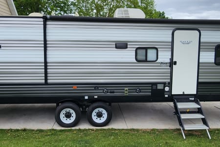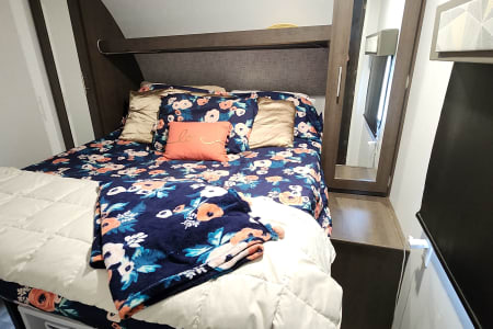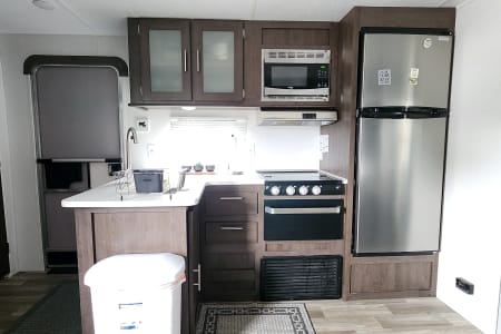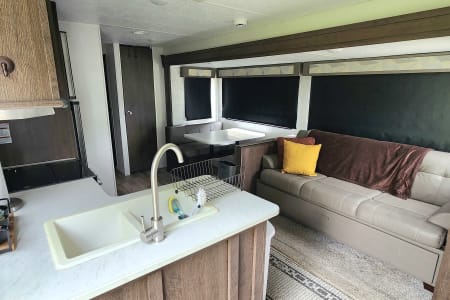 Our camper comes with 2 double bunks, queen bedroom, sofa turns into a bed and the table can be made into a bed to sleep up to 10 people. (We do not supply bedding) We have coffee and cups to get your morning started on the right foot. We have a camping rug, table and garbage cans for outdoor use. We have pots and pans and kitchen utensils. Our camper does not have an oven but it has a stovetop. All hook ups for water, electric and sewer. We have a smart t.v. and a DVD player with some movies and games to play if it rains. Any other questions please feel free to ask.