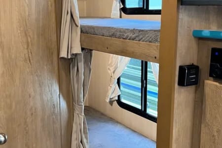 Inside, the iconic aqua-green interior feels like stepping into a postcard. Enjoy a comfy queen bed for two while the kids claim their own cozy bunk beds. The kitchen is fully stocked and ready for everything from pancake breakfasts to easy campground dinners, featuring a microwave, 3-burner gas range, oven, and double-door fridge/freezer.