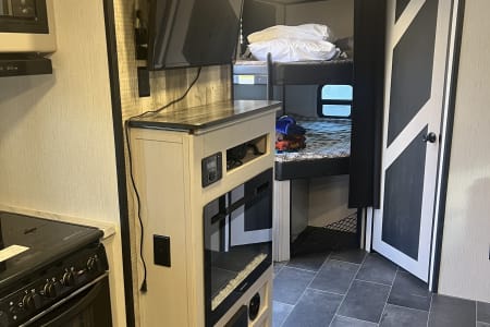 King size master bed, two bunk beds and dinnette converts to a bed to sleep 2 more. Outdoor kitchen sink, fridge and grill. 18' electric awning. Air conditioning as well as furnace and fire place.