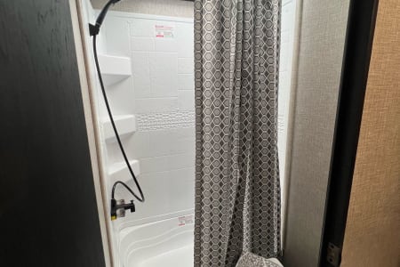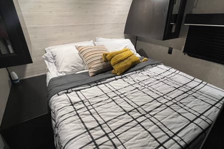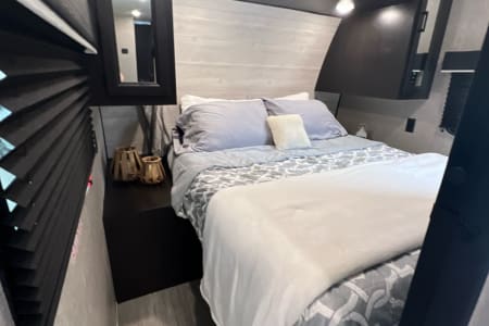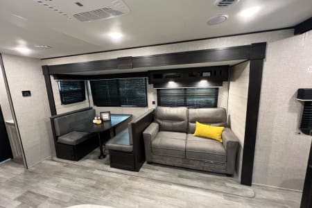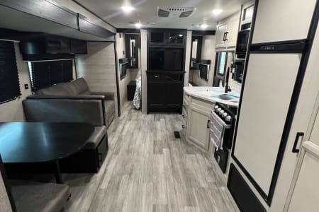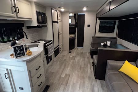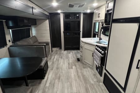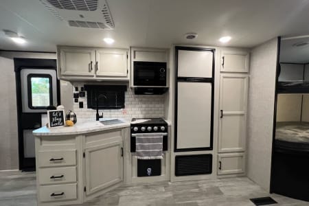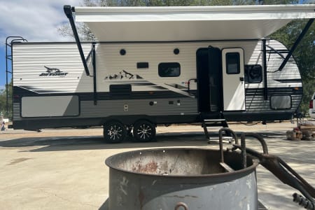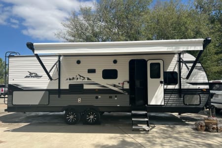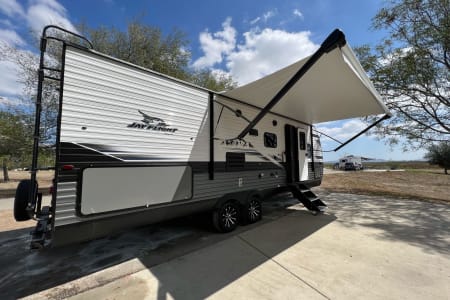 Brand New! 2023 Jayco Jay Flight 267BHSW Bunkhouse Travel Trailer Fully equipped with all things necessary for you to enjoy your camping experience with your family and friends. It features a powered awning with LED lights strip to brighten your nights and keep you protected from the elements, a generator to aid with dry camping ($35/night), 3burner stove top, oven with glass door and interior light, range hood, microwave, large sink, over sized refrigerator, a couch that pulls out into a bed and two large rear bunks (48x80). Built in speakers both inside and outside powered by a bluetooth stereo, central AC and Heater controlled by an easy manual thermostat, a front private Queen bedroom and a full bathroom with tub/shower combination and outside shower.