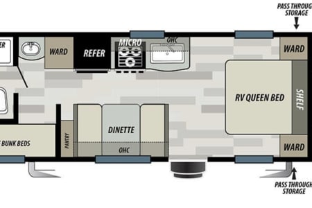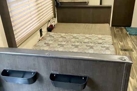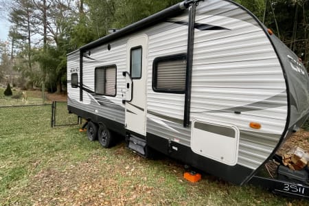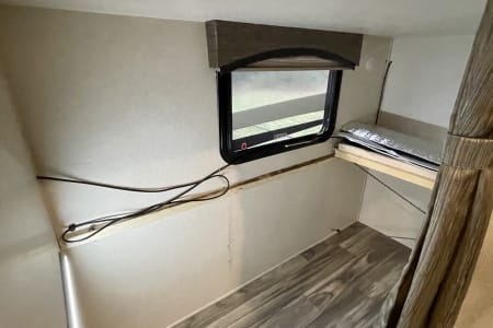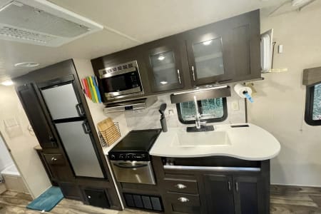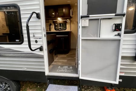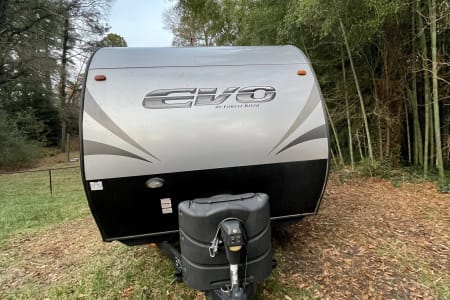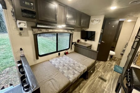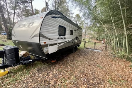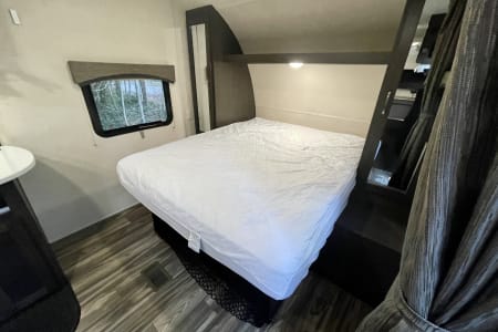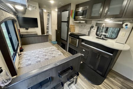 Eve is a 2019 Forest River Evo T2250 with all the bells and whistles. Setting up is a breeze, and the whole leveling process can be done with a remote to exact precision using the installed levelers. With the Arctic package, don’t worry about getting cold in the winter. Comfortably sleeping 6 with a RV Queen, convertible dinette, and a double bunk, don’t worry about finding storage for everyone’s things as this travel trailer is loaded with custom storage solutions. The pantry has added shelves, and find a double shelving unit under the end of the bed for shoes or extra items. This unit offers a great bathroom, complete with an upgraded shower head that turns the lousiest water pressure into a refreshing shower. Don’t worry about takeout, as the kitchen offers an oven, gas stove, microwave, fridge and freezer, and full sized sink.