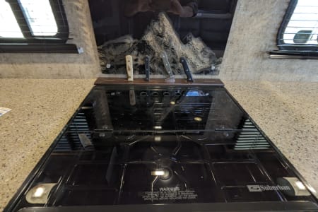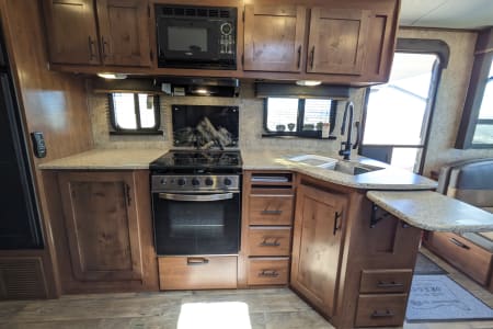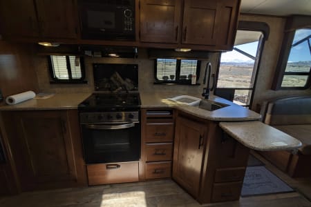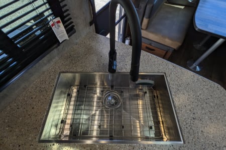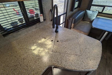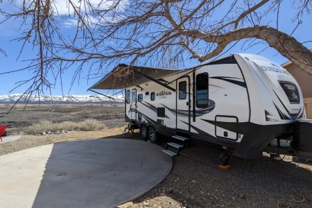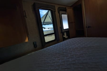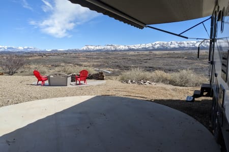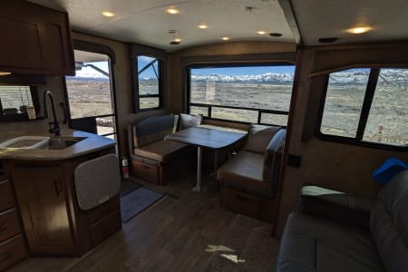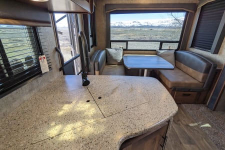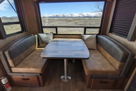 Take in your view from the expansive rear dinette windows. Outdoor rug, 2 fold up portable camp chairs included for use.