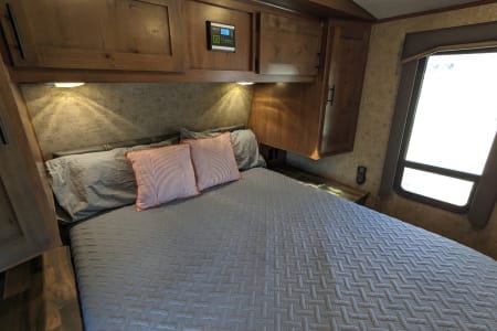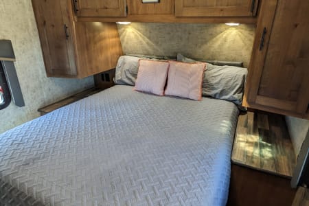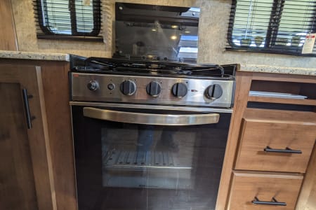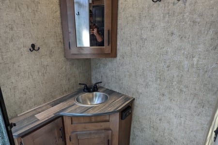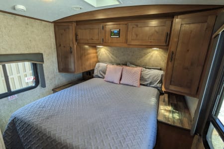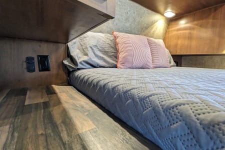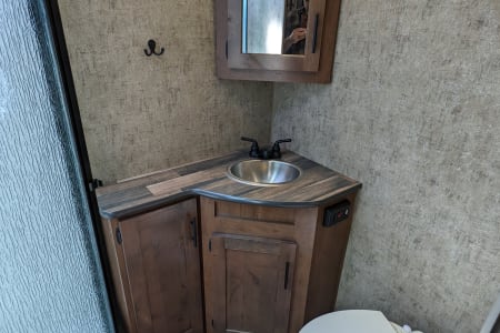 Linens included for a full sized queen bed. Enjoy some privacy in the enclosed dry bath with shower, sink and toilet. The kitchen includes cutlery, and cookware, a farm style kitchen sink with covers for extra counter space, an 8 cubic foot refrigerator, a three burner stove, french press and microwave.