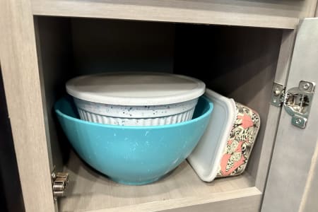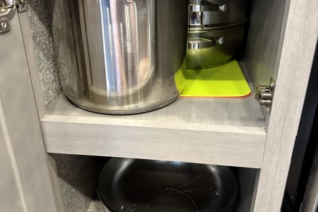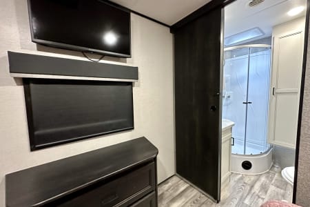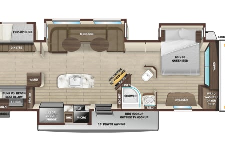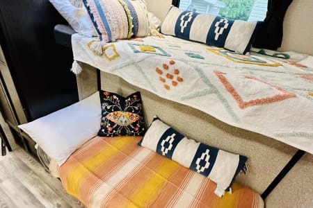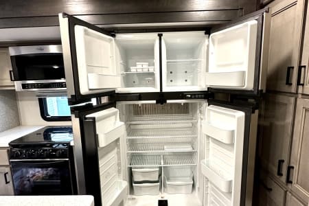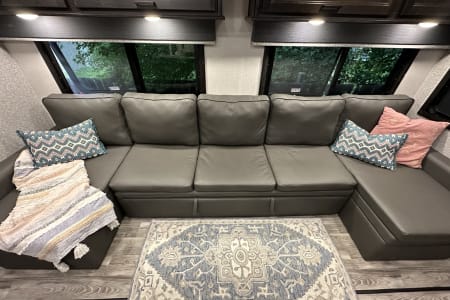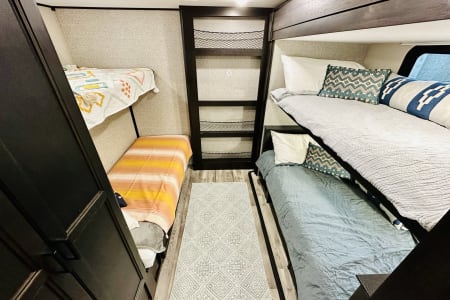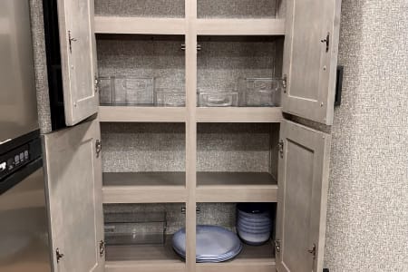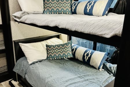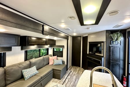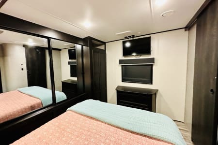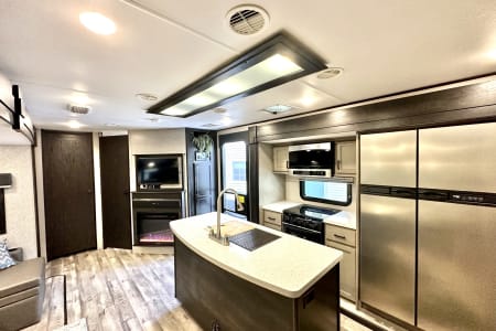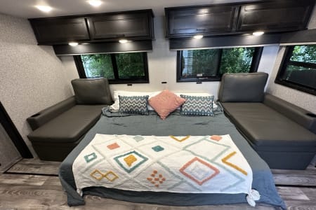 From large or multifamily use or if you just want to have space to stretch out this is the most comfortable and convenient layout there is. Real doors separate bedrooms and living space, no curtains or tie backs. The kitchen is stocked with everything needed to cook your favorite dinners with bakeware and a full size microwave. The double fridge and freezer fit so much and the additional fridge in the outside kitchen is perfect for cold drinks or just as extra space. Storage is extreme in this unit with a full pantry in both kitchens, under seat storage at each couch/bed and ample closet space.