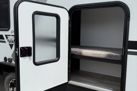 "The Duck" as we affectionately call it, is the perfect little trailer for a family getaway! With a queen bed at the front, twin bunks at the back and the option to convert the table into an additional bed, the whole family fits comfortably.