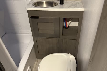 Kitchen includes sink, microwave and stove plus we have included pans, utensils and dishes for convenience. The compact bathroom comes stocked with RV toilet paper and hand soap.