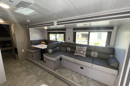Mornings are a delight in the "Wildwood Retreat" as you sip your favorite coffee next to the charming electric fireplace, creating a warm and inviting atmosphere. Immerse yourself in a world of music with the integrated Bluetooth audio system while enjoying meals and conversation in the U-shaped dinette. As night falls, effortlessly transform the dinette and couch into spacious beds, providing plenty of room for everyone to rest and recharge.