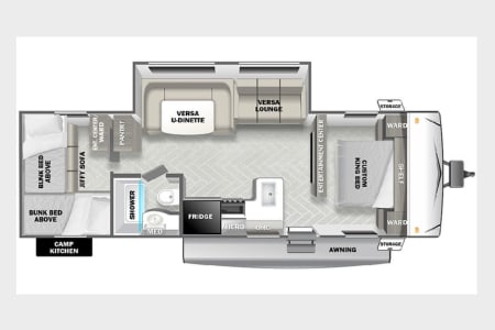 Discover the perfect harmony of privacy and togetherness with our ingenious bedroom arrangement. The "Wildwood Retreat" features a unique bunk room design that will captivate both parents and children alike. Parents will relish their own private bedroom, providing a peaceful sanctuary for rejuvenation. Meanwhile, the little ones will delight in their very own private bedroom, complete with a Smart TV, three cozy bunks, a comfortable couch that doubles as an additional bed, and ample space for play and imagination. Stay organized and connected with abundant storage options and conveniently placed USB ports throughout the trailer.