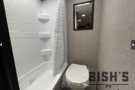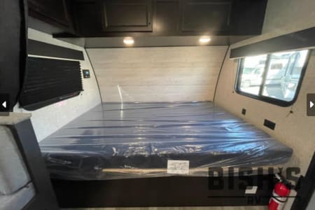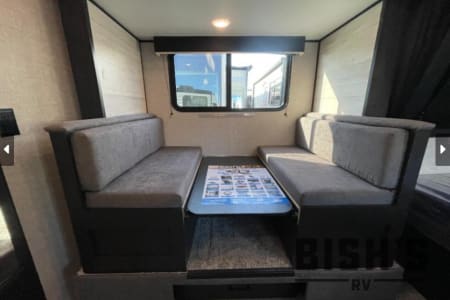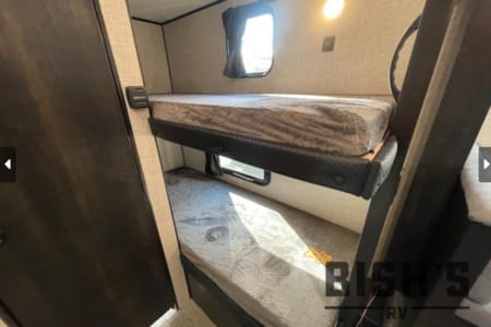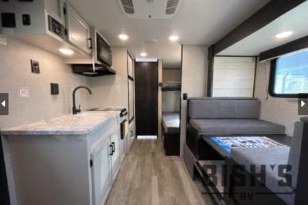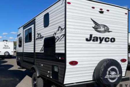 This New 2023 Jayco Jay Flight SLX 184 Baja Western edition is a kid and pet friendly trailer perfect for your family's next Adventure! A family or group of six will love this trailer for it's ability to be easily towed and cleaned after a fun weekend outdoors! Two will be able to enjoy the semi-private front queen bed upgraded with memory foam topper, and a curtain, two will love the bunk beds, and other can sleep on the booth dinette slide once it is easily setup for bedtime. The chef of the group will have a two-burner range and microwave to cook inside, and a 6 cu. ft. refrigerator for the beverages and cold food. Everyone can take turns getting cleaned up or dressed in the private toilet and tub/shower room. The slide-out provides a roomy feel, perfect for relaxation. The 10' power awning provides shade, and protection no matter the weather.