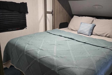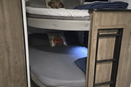 The kiddos are going to be excited about hanging out on the double-size bunks with a ladder after hiking and exploring around the campgrounds. A feature you are sure to like is the exterior entry door into the full bathroom which allows you to easily access the bathroom from outside when relaxing under the power awning. The main living and kitchen area offers a slide out which includes a booth dinette and sofa and provides more floor space in this area and the kitchen. The cook will have full amenities including a three-burner cooktop and microwave oven, plus an 8 cu. ft. double door refrigerator. And when you need privacy, open up the sliding door into the front bedroom and take a nap on the queen bed.