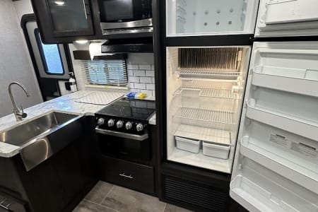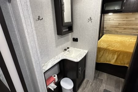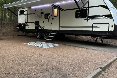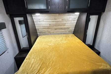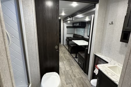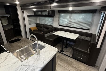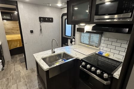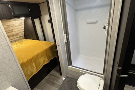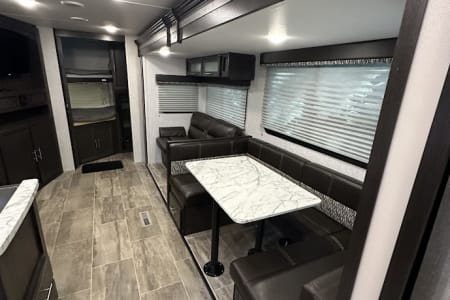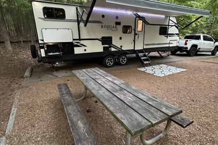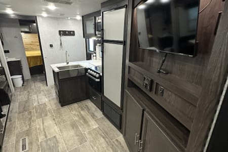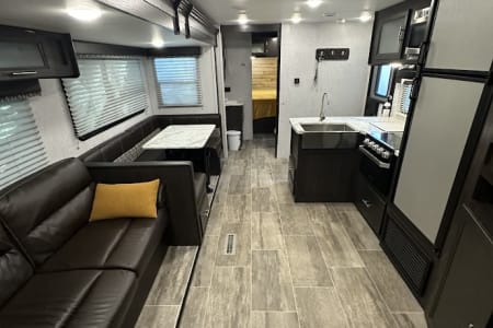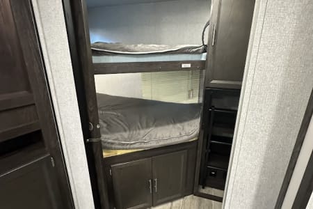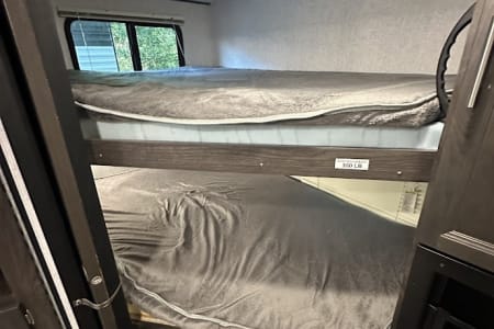 This is a great family camper with lots of room of EVERYONE! Delivery is available for all Allatoona Campgrounds! It has a private bedroom in the front with a full size memory foam queen bed and large bunkbeds in the rear. The Big Slideout has a large U-shape dinette table and 60" sofa that both fold out to make comfy beds! The kitchen includes a great refrigerator/freezer, huge slide out pantry, stove top with 3 burners, oven and all of your cooking essentials! Lots of lighting inside and out along with some LED light strips that make great mood lighting! There is a 32" smart TV that . The walkthrough bathroom has a comfy setup and a large shower with a retractable door. The electric & propane hot water heater works great. There are plenty of USB charging ports and cabinets for storage throughout the interior.