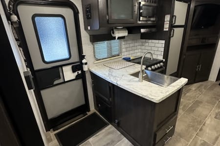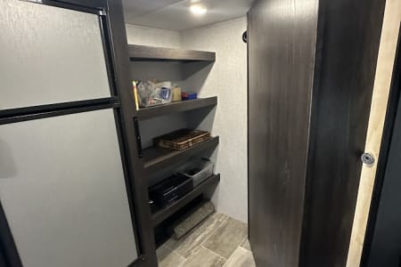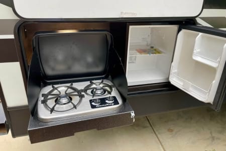 There exterior boasts a great 20' awning with LED light strip and outdoor kitchen with a mini fridge and pull out grill top. The outdoor shower with hot/cold water is great for rinsing off after a swim in the lake!