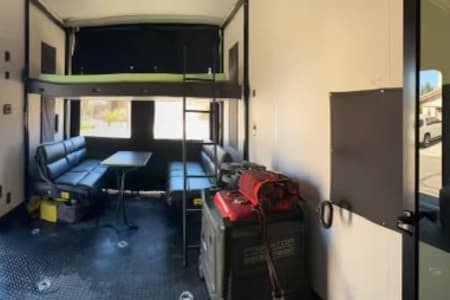 Large 5 wheel toy hauler, 16’ separate garage, with drop down bunk beds. 2 bathrooms, separate master suite. Full kitchen, microwave, gas stovetop, oven , large refrigerator with freezer. 3 TVs, 1 that be moved outside, outdoor kitchenette with outdoor fridge/freezer. Ice maker.