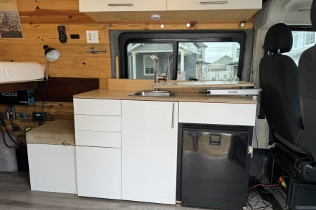 -Cooking Essentials: Portable induction burner, mini fridge with freezer, and a sink with a pump using a removable tank.
