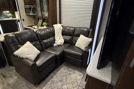 Living room with a 55" TV, DVD player and a large DVD collection, one sectional couch which can also be used for sleeping and love seat that reclines and has a massager.