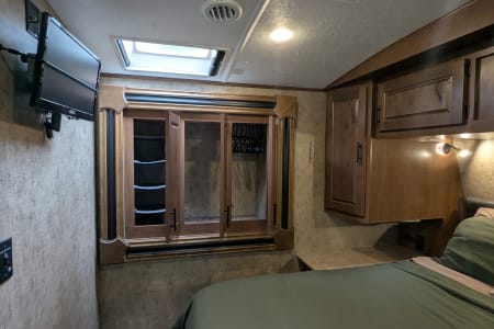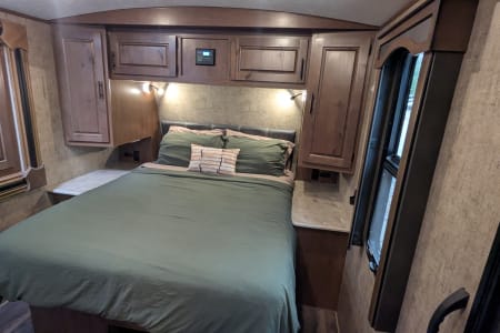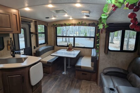 The Wine Den also offers a fully stocked kitchen, bedding and towels, and a complimentary bottle of wine of your choosing. Sleep-in after that late night glass of wine with black-out shades, and cool-off in the shade in the afternoon with the Wine Den's power awning. Delivery is provided so you can enjoy time with your dog over a glass of wine in the beautiful Traverse City area without any of the hassle.