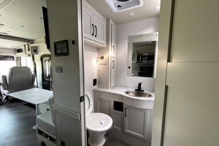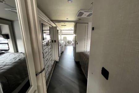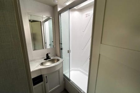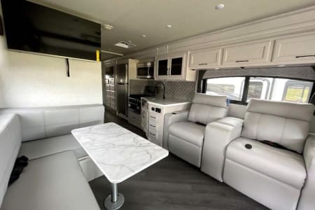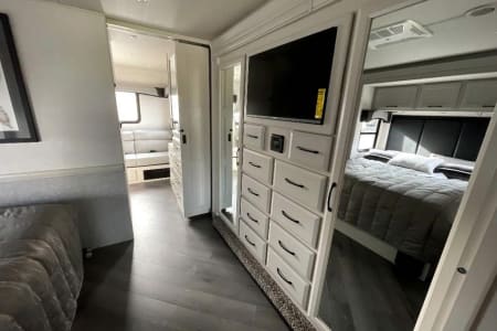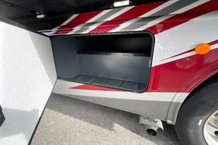 Your crew of ten will love this spacious coach! There is a full-wall slide plus a queen bed slide out that will provide ample space for everyone to stretch out. Your guests or the little ones can sleep in the rear private bunkhouse suite with a bunk bed, a jackknife sofa, their own swing LED TV, plus a half bath; how convenient! You will have the private bedroom all to yourselves with a Serenity Series RV queen bed, dual wardrobes, and a bedroom LED TV with a dresser to keep your clothes tidy. After a day of traveling, everyone can relax in the main living area on the jackknife sofa or at the L-shaped dinette. There is a third LED TV here plus a Hide-A-Loft electric drop-down bunk for one or two guests. The kitchen includes everything you need to prepare meals each day, including a three burner cooktop, a stainless steel convection microwave, a residential refrigerator, plus a pantry for snacks and paper goods. And don't overlook the exterior with its exterior kitchen that includes a mini-fridge and pull-out griddle, plus a quick connect spray down hose and storage!