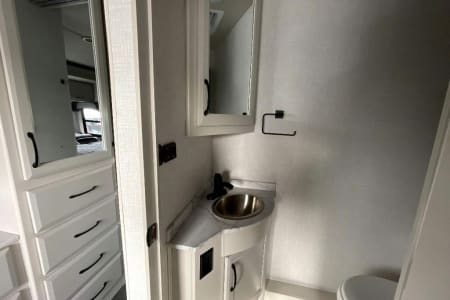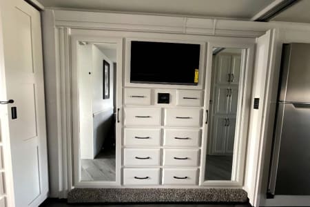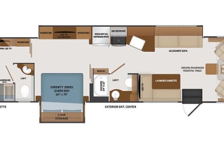The Kid Kave features a balcony loft with storage underneath. There is also an option for an all-in-one washer and dryer. A jackknife sofa, additional wardrobe, swing LED TV and dedicated half-bathroom help make the Kid Kave a fun-filled retreat for kids of all ages.