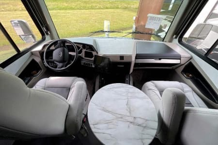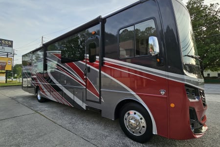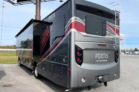 The Fleetwood Fortis Class A gas motorhome is a powerhouse of luxury and convenience, and it also is quite literally a powerhouse with its Ford 7.3L V8 350HP engine with 468 LB/FT of torque. The construction includes a Dryseal edge coating for all ceilings, walls, and floor, and the Powerlock System 2 has interlocking walls to the roof for stability. Automatic hydraulic leveling jacks make the set-up process easier, and the cab has excellent features, like a 9" stereo with AM/FM/Bluetooth, backup camera, reclining/swivel cab seats, driver/passenger center table, and an automotive-style dash with dual monitors and workstation. You will find vinyl tile flooring all throughout the interior, as well as full-extension drawer guides with latches, coordinating window treatments, and energy-efficient LED flush-mount ceiling lighting.