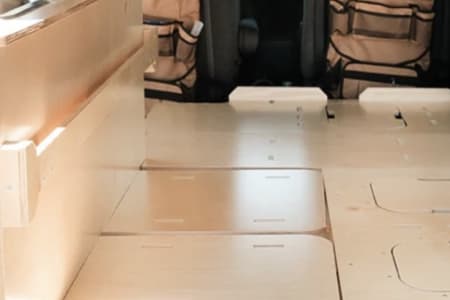 Beautiful birchwood modular camper van conversion kit from VanLabsUSA offers kitchen seating to twin bed mattress conversion. Interior kitchen sink and RV 12Volt refrigerator makes for a glamping trip success. Tables can be moved around for 2-3 configurations for eating, working and sleeping.