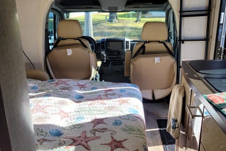 This little gem of a motorhome has great features! It sports a solar panel and a diesel generator to camp off grid. There is a convection oven microwave and a two-burner stove top. The kitchen is fully stocked for 4 people and has a TV for viewing in the living area. The twin beds in the back can be made into a California King-sized bed. Just let us know what size bedding you would like us to pack for you. There is an over cab bunk bed, and the sofa pulls out to make a bed as well. The View sleeps 4 adults comfortably or 2 adults and 4 children. The back bedroom also has a TV.