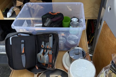 Kitchen/Cooking: Dometic fridge to keep groceries cool, table and portable hand-pump sink included. Basics for cooking also included: camp stove, fuel, fry pan, cast iron pan, pot, cutlery, utensils, Yeti cups, cooking oil, salt pepper, trash bags, etc. Additional cooler available on request.