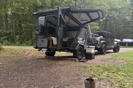 Attached awning on the back over pull out galley kitchen drawer with room attachment - three sided room awning attachment (shown in last pic) adds privacy and living space - $65/trip