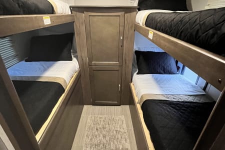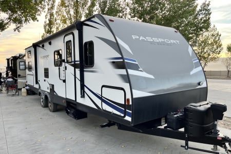 Discover adventure and comfort with our 2019 Keystone Passport camper. At 32 feet, this well-maintained travel trailer offers ample space to comfortably accommodate up to nine people. Ideal for family getaways or group trips, it features a bunkhouse with two sets of bunk beds, ensuring everyone has their own space.