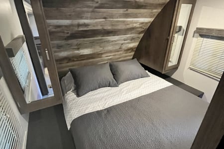 Enjoy the convenience of an outdoor kitchen, perfect for al fresco dining and making the most of your outdoor adventures. The U-shaped dining area provides a cozy space for meals and gatherings. Inside, you'll find modern amenities, including AC and heat, to keep you comfortable in any weather.
