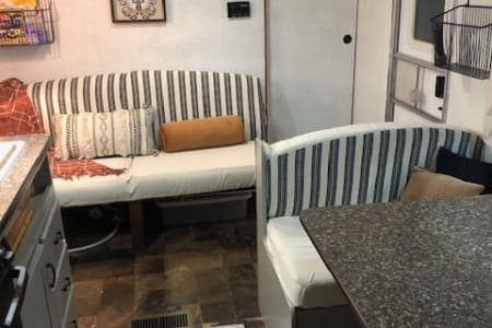 The perfect size travel trailer, easy to tow and easy to park!! Dining room. Complete with all the pots, pans, silverware and dishes. Coffee maker, full kitchen with oven to bake and a microwave. Large flat screen TV for those rainy days. The dining area and couch both convert into a sleeping area. There is also additional equipment as the camper is fully stocked with: Forks for roasting marshmallows/hot dogs, used over the fire, fishing poles three adults and two children size, Lawn chairs. The only things you will need is cloth. blankets, and your food. I will set up the camper on your reserved site within 75 miles of Elizabeth City North Carolina for a small fee. If you are planning on picking up you will need a vehicle capable of towing 6000 lbs., class III hitch, brake controller and 7 pin plug (1/2 Ton Pickup or similar)