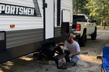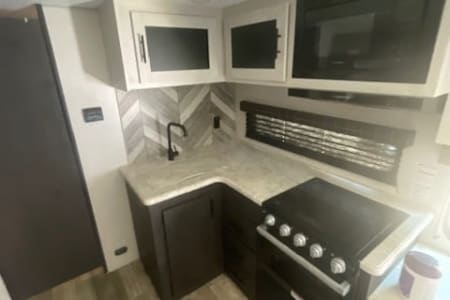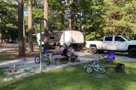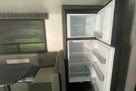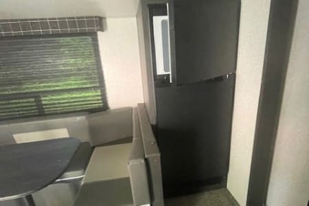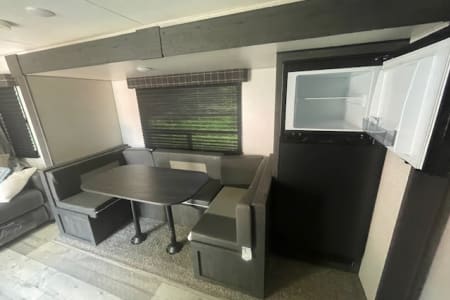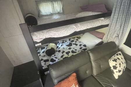 This camper is great for a family that needs sleeping space for 7 or a group of friends that enjoys camping together! Murphy bed folds out from couch comfortable great sleep for 2 adults. There is a set of bunk beds in the front living room. The bathroom separates the master bedroom for convenience and privacy, and the dinette slide out offers dining and sleeping space, plus extra floor space for all to move about the trailer. Length: 32.58' | Weight: 5780.0 lbs | Slide Outs: 1 | Sleep Number: 7 | Exterior Height: 10.67' | Fresh Water Tank: 45.0 gal | Black Water Tank: 32.0 gal