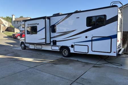 This almost new bunkhouse model provides a designated sleeping area for kids—conveniently located across from the bathroom! There's a 28" x 72" flip-down bunk that folds flat against the wall up above, with a kids' sofa sleeper that folds out to a bed below. The adults can enjoy their own separate sleeping area in the rear, where the main bedroom is located. The bathroom is compact, but offers a 24" x 32" shower with tub, along with linen storage. In the main living area, the kitchen is set up to maximize space, while a booth dinette and sofa provide additional seating and sleeping areas. In front, a 60" x 80" cab over bunk gives you even more space! Built on the Ford E450 Chassis.