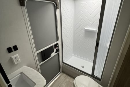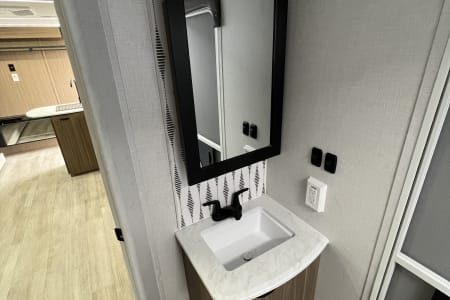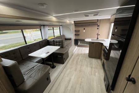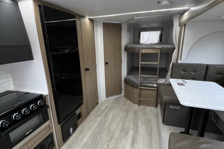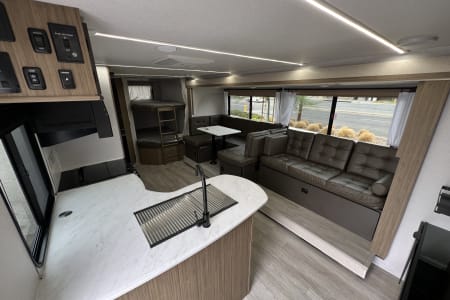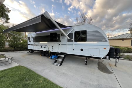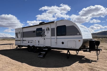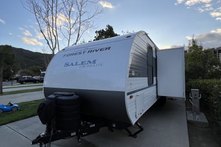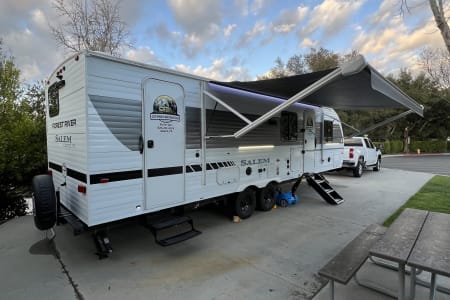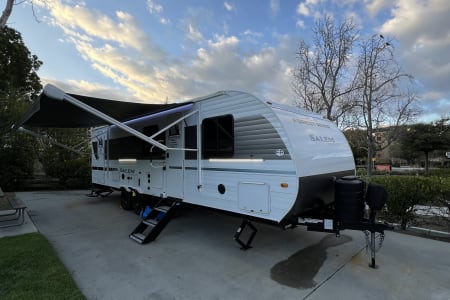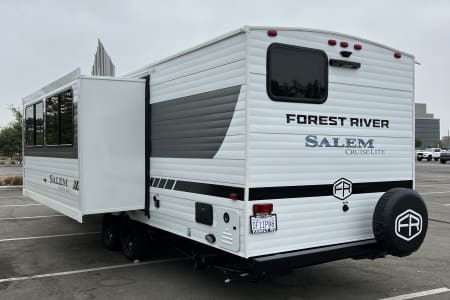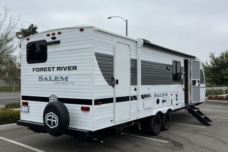 Welcome to Getaway Adventure Rentals located in Sunny Southern California. Here we have our new 2025 Forest River Salem Cruise Lite 263BHXL. If you're looking for a travel trailer that will meet your family's needs then this one is for you! The kiddos will enjoy a good night's rest on the rear corner double-size bunk beds and you will enjoy a good night's rest on the custom king bed inside the front private bedroom. You can also transform the U-shaped dinette and Versa-lounge into extra sleeping spaces. One of the dual entrances leads directly into the rear corner bathroom which has a walk-in shower for you to get squeaky clean each morning. The walk-in pantry is big enough to store your favorite snacks and the oversized refrigerator will keep your beverages nice and cold. There is also an exterior camp kitchen you are sure to love! Currently there's is a 50 inch smart tv in the living room and a 32 inch smart tv in the bedroom.