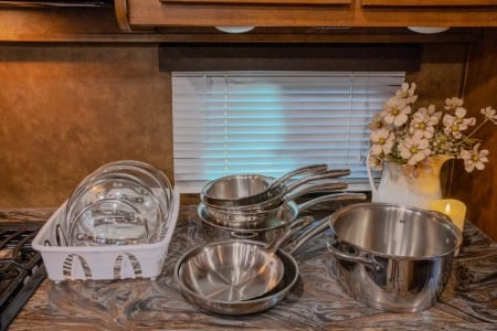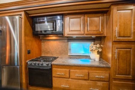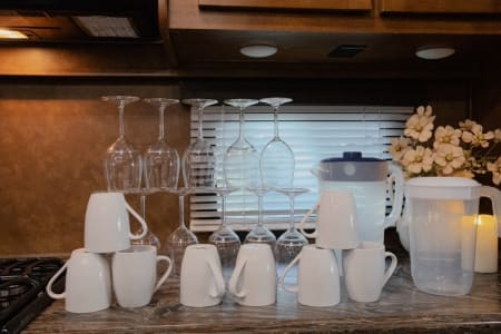 Whip up delicious meals with a huge residential refrigerator, microwave, gas stove, a Ninja Foodi 6-in-1 Indoor Grill, a Keurig K-Cup & Carafe Coffee Maker, an electric griddle, and an island sink with more Corian space. Plus, there's an integrated pet food/water drawer for your furry friends!
