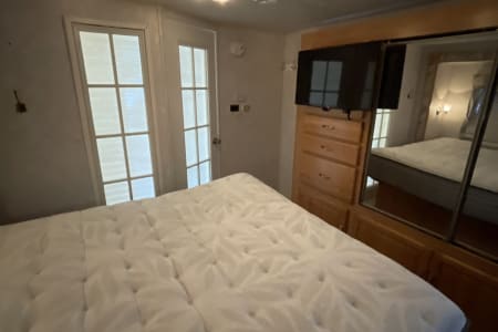 Mobile homes comes with all bedding plates and silverware. Brand new Swing chairs for around the fire total 4. Barbecuer is down below hatch storage. Fully loaded everything you could possibly dream up it has.