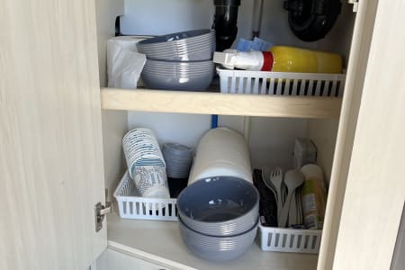 The gray water tank holds 8 gallons from the sink drain. Please drain it before returning the van to avoid a $100 dump fee.