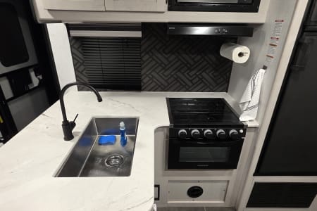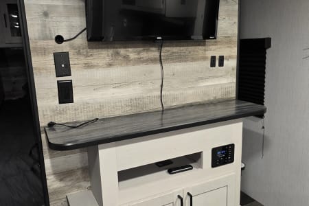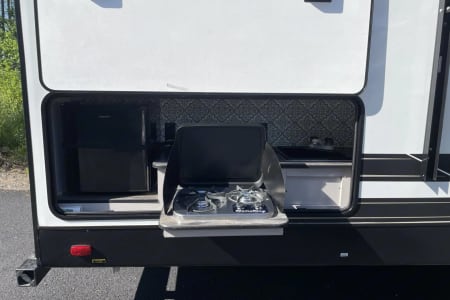 Outside, take advantage of the exterior slide-out cooktop — perfect for grilling and dining al fresco. And when it’s time to unwind, the power awning provides shade and shelter, so you can relax outdoors in comfort, rain or shine.