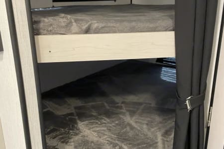 Inside, you'll find spacious double-size bunk beds tucked next to a full corner bathroom — ideal for easy access. The large slide-out opens up the living area, creating plenty of room to move around, relax, and unwind.
