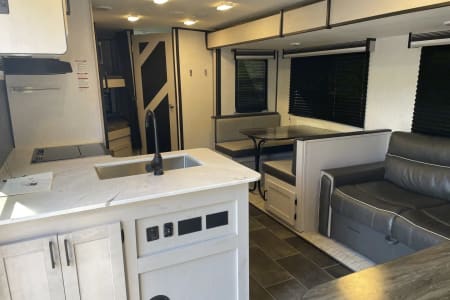Gather around the booth dinette to enjoy a family meal, play a board game, or convert it into an additional sleeping space for guests. A cozy sofa sits nearby, offering even more room to kick back after a day of exploring.