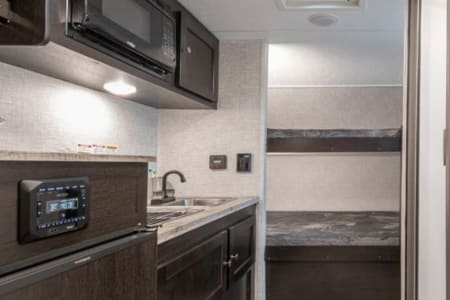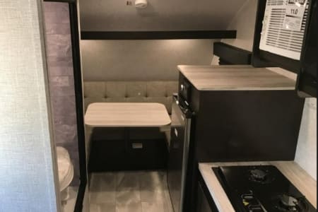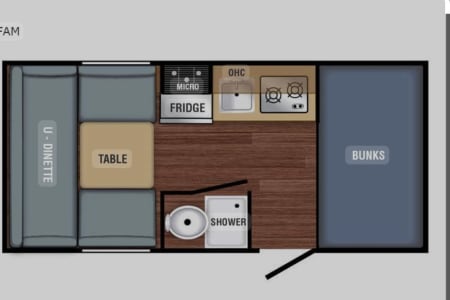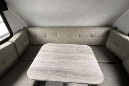 The trips can be endless with this free solo family addition that we affectionately call Papa Smurf. This is extremely light weight and if your vehicle has a hitch you can probably tow it! Two roomy bunks to one side that sleeps up to 250 pounds and the other side has the dining table that can be converted into a bed. It’s not a big one but great option for those who do not have a large towing capacity!
